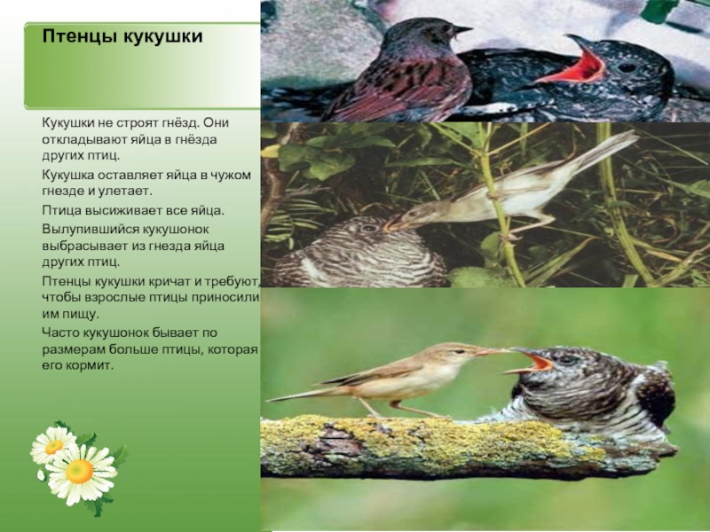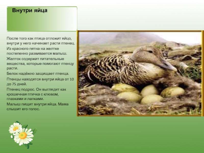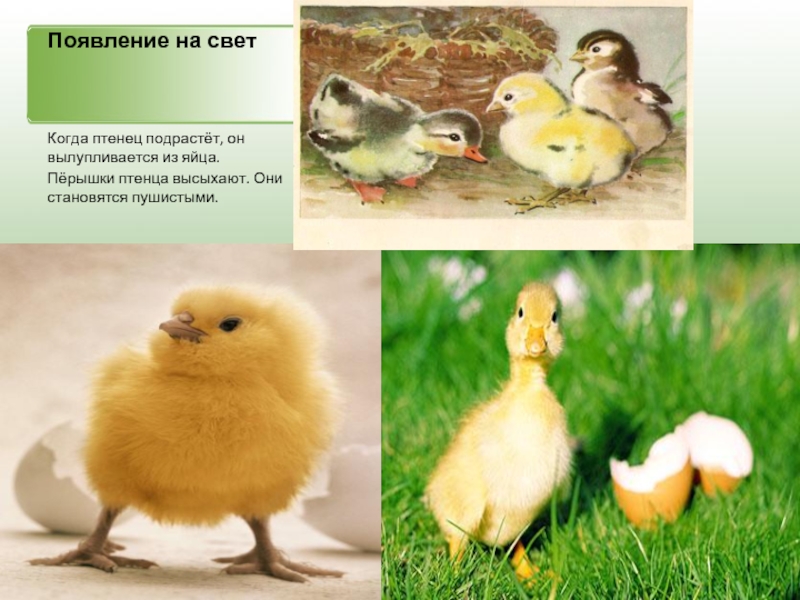 Все птицы откладывают яйца из которых потом вылупляются птенцы. Большинство птиц заботятся о своих малышах, пока они не подрастут.