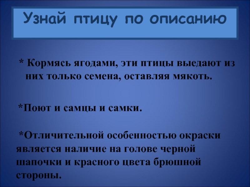 *Отличительной особенностью окраски является наличие на голове черной шапочки и красного цвета брюшной стороны.