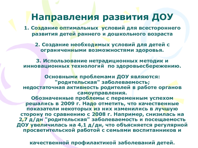 Обозначенные проблемы с переменным успехом решались в 2009 г. Надо отметить, что качественные показатели некоторых из них изменились в лучшую сторону по сравнению с 2008 г. Например, снизилась на 2,7 д/дн "родительская" заболеваемость и посещаемость ДОУ увеличилась на 4,1 д/дн, что объясняется регулярной просветительской работой с семьями воспитанников и качественной профилактикой заболеваний детей.