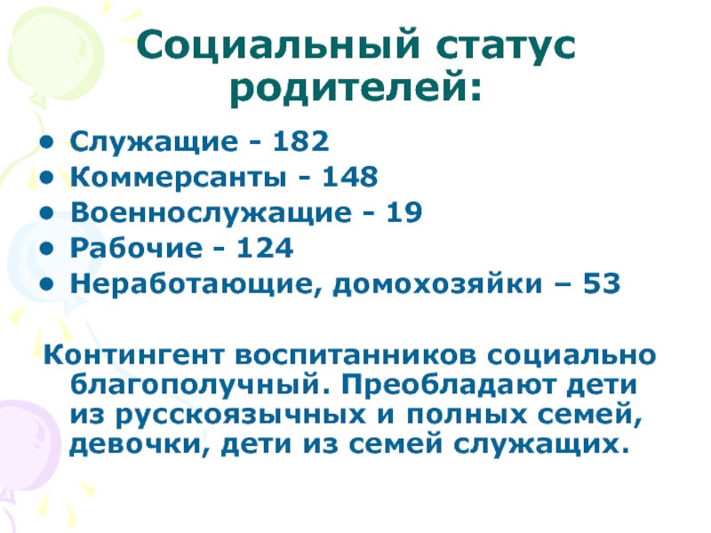 Контингент воспитанников социально благополучный. Преобладают дети из русскоязычных и полных семей, девочки, дети из семей служащих.