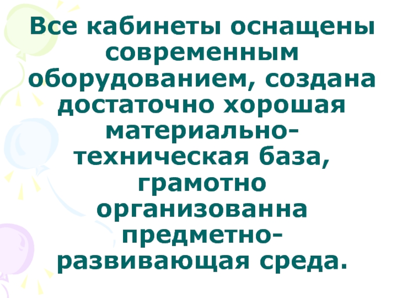 Слайд 12Все кабинеты оснащены современным оборудованием, создана достаточно хорошая материально-техническая база, грамотно