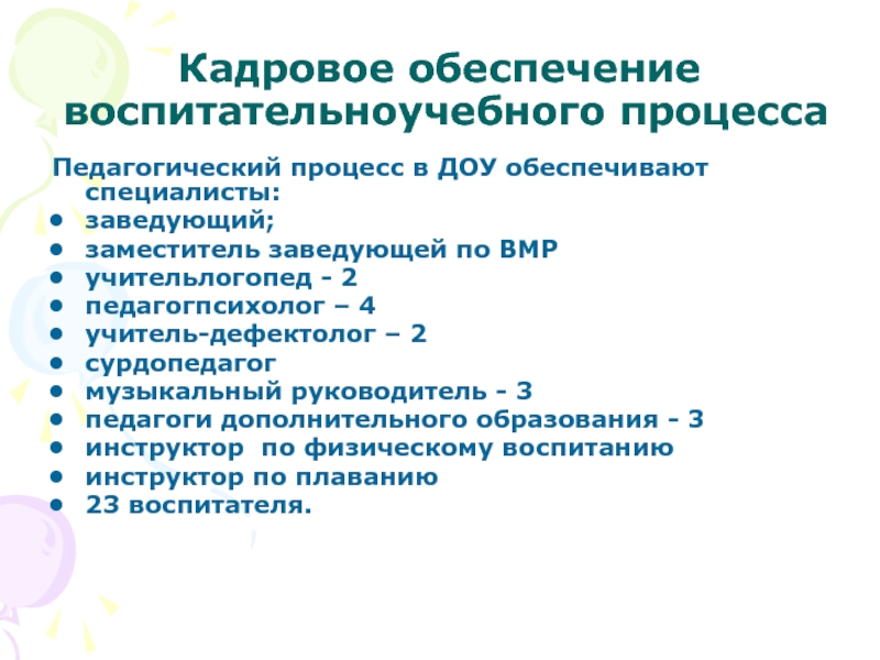 Педагогический процесс в ДОУ обеспечивают специалисты: