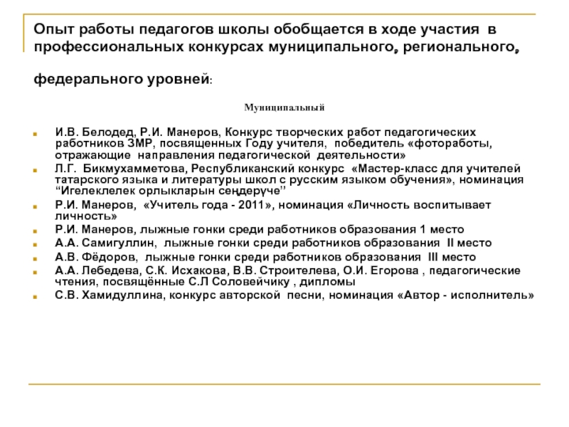 Слайд 11Опыт работы педагогов школы обобщается в ходе участия в профессиональных конкурсах