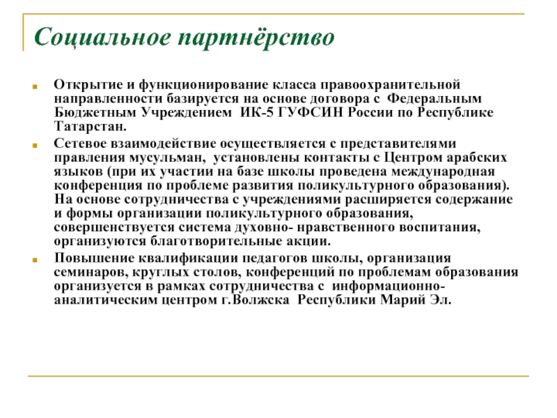 Сетевое взаимодействие осуществляется с представителями правления мусульман, установлены контакты с Центром арабских языков (при их участии на базе школы проведена международная конференция по проблеме развития поликультурного образования). На основе сотрудничества с учреждениями расширяется содержание и формы организации поликультурного образования, совершенствуется система духовно- нравственного воспитания, организуются благотворительные акции.