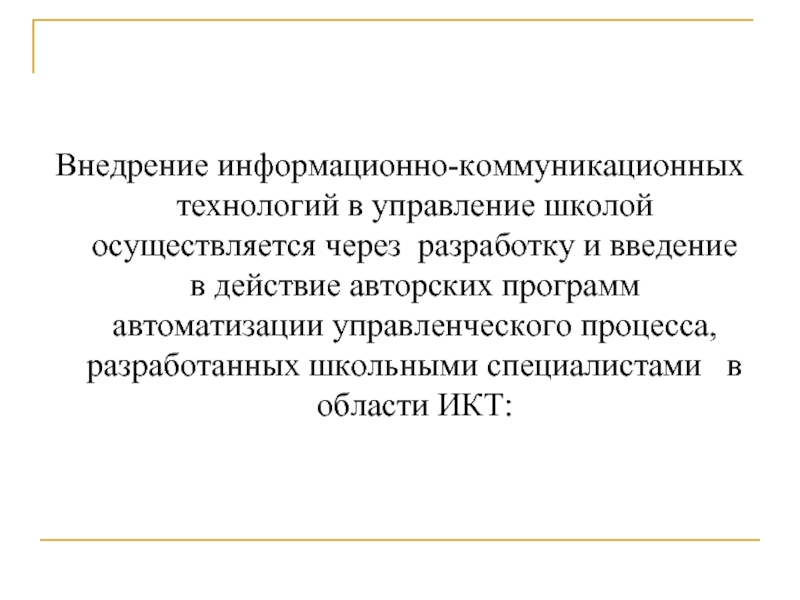 Слайд 20Внедрение информационно-коммуникационных технологий в управление школой осуществляется через разработку и введение