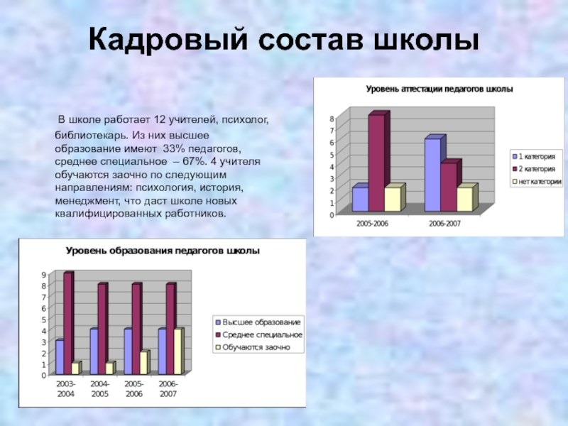 Из них высшее образование имеют 33% педагогов, среднее специальное – 67%. 4 учителя обучаются заочно по следующим направлениям: психология, история, менеджмент, что даст школе новых квалифицированных работников.