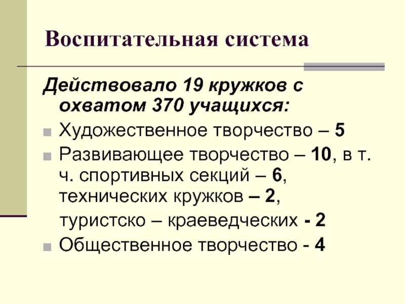 творчество – 10, в т.ч. спортивных секций – 6, технических кружков – 2,