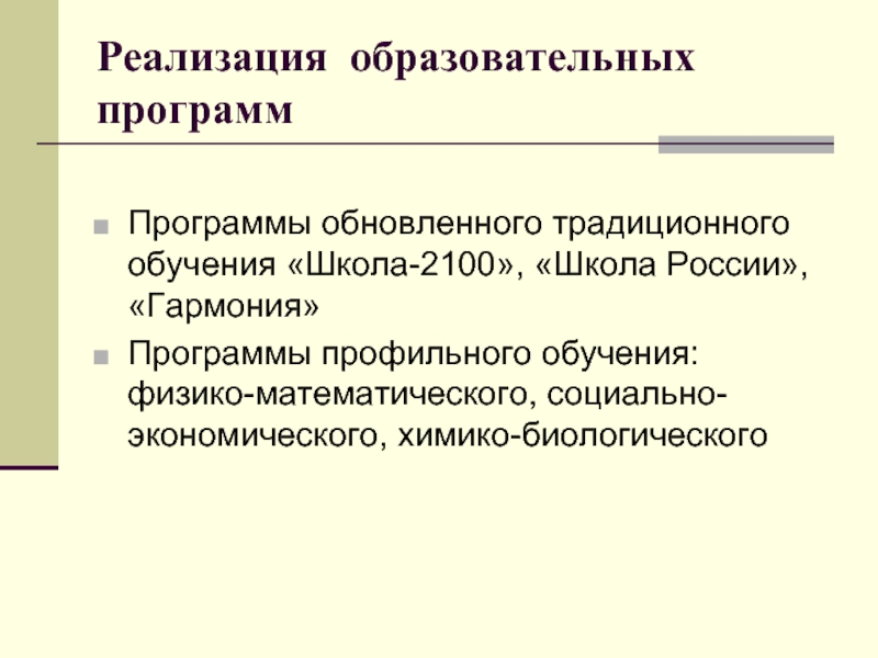 Слайд 4Программы обновленного традиционного обучения «Школа-2100», «Школа России», «Гармония»