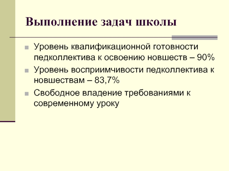Уровень квалификационной готовности педколлектива к освоению новшеств – 90%