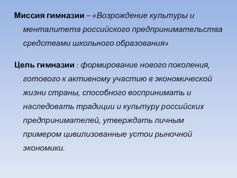 Цель гимназии : формирование нового поколения, готового к активному участию в экономической жизни страны, способного воспринимать и наследовать традиции и культуру российских предпринимателей, утверждать личным примером цивилизованные устои рыночной экономики.