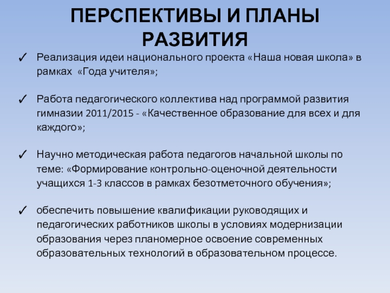 Работа педагогического коллектива над программой развития гимназии 2011/2015 - «Качественное образование для всех и для каждого»;