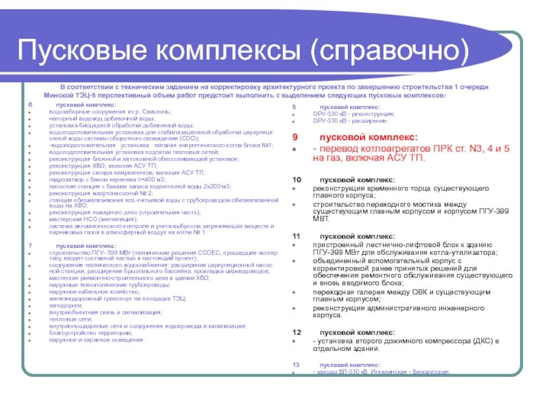 В соответствии с техническим заданием на корректировку архитектурного проекта по завершению строительства 1 очереди Минской ТЭЦ-5 перспективный объем работ предстоит выполнить с выделением следующих пусковых комплексов: