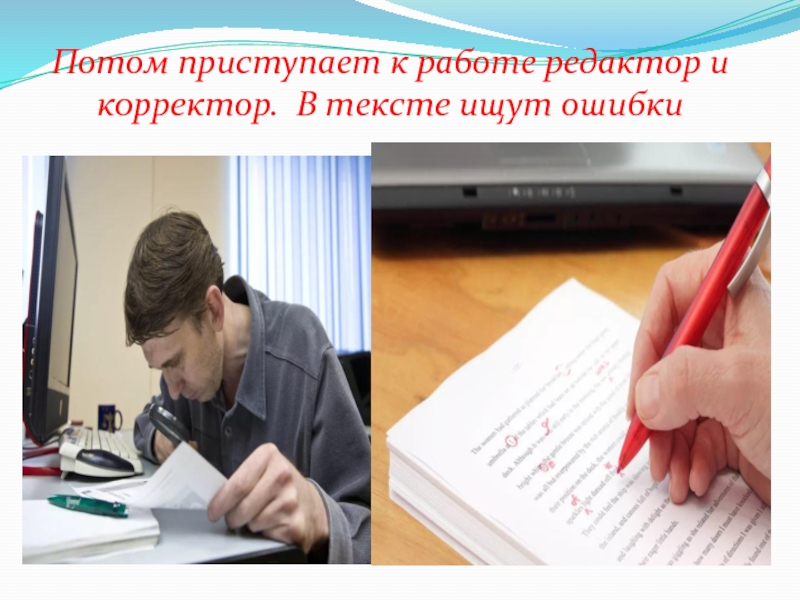 Слайд 14Потом приступает к работе редактор и корректор. В тексте ищут ошибки
