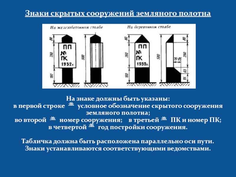 его между километровыми знаками через 100 м. Порядковые номера пикетов изображают на двух противоположных сторонах, перпендикулярных оси пути, с одной стороны - номер окончившегося пикета, с противоположной стороны - начинающегося за знаком.