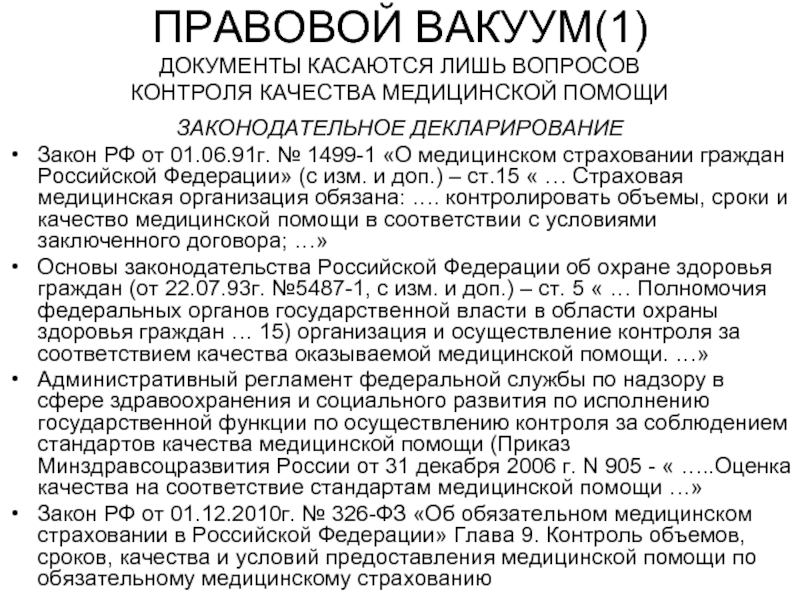 Основы законодательства Российской Федерации об охране здоровья граждан (от 22.07.93г. №5487-1, с изм. и доп.) – ст. 5 « … Полномочия федеральных органов государственной власти в области охраны здоровья граждан … 15) организация и осуществление контроля за соответствием качества оказываемой медицинской помощи. …»