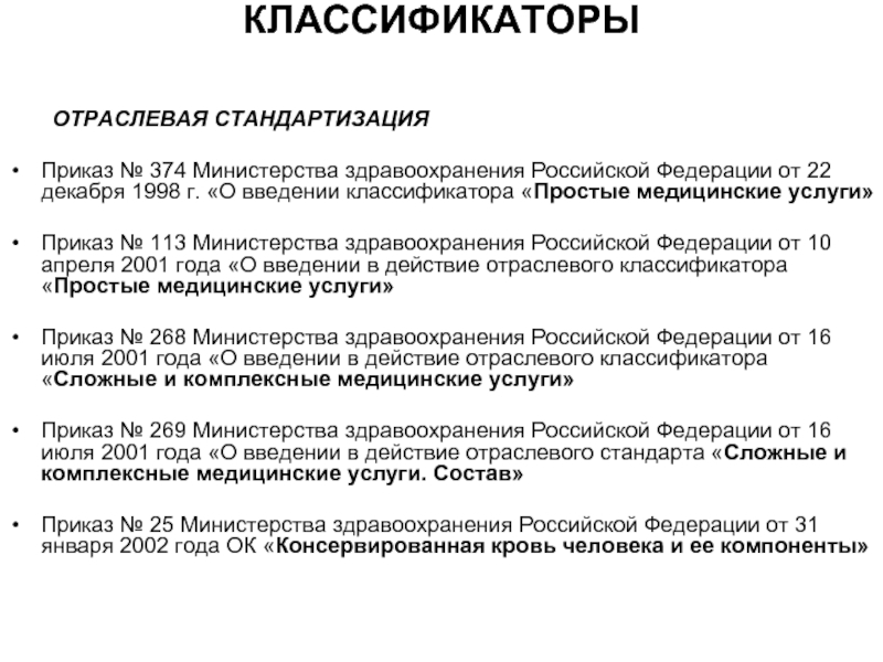 Приказ № 268 Министерства здравоохранения Российской Федерации от 16 июля 2001 года «О введении в действие отраслевого классификатора «Сложные и комплексные медицинские услуги»