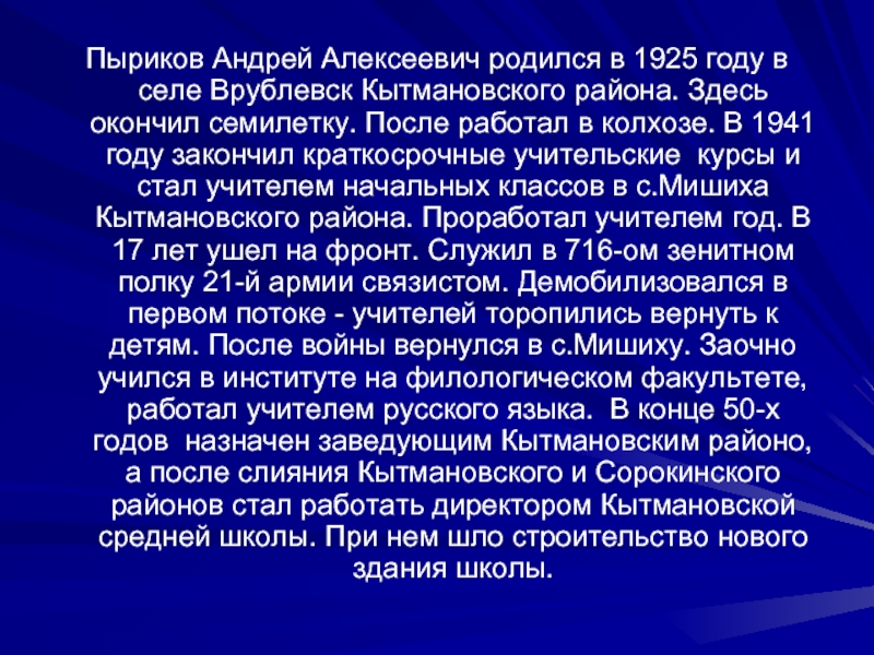 Слайд 2Пыриков Андрей Алексеевич родился в 1925 году в селе Врублевск Кытмановского