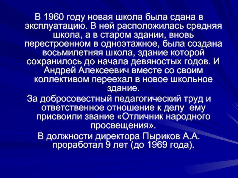 Слайд 1Пыриков А.А. –директор школы с 1960 по 1969 годы
