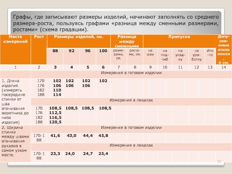 Слайд 15Графы, где записывают размеры изделий, начинают заполнять со среднего размера-роста, пользуясь