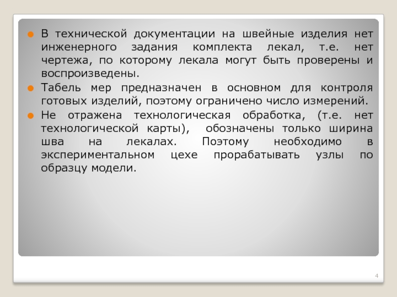 Слайд 4В технической документации на швейные изделия нет инженерного задания комплекта лекал,