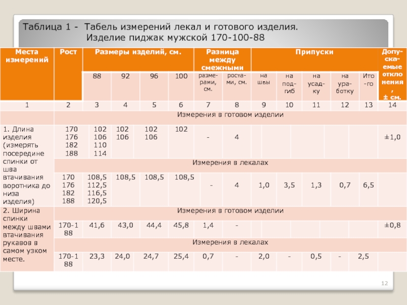 Слайд 12Таблица 1 - Табель измерений лекал и готового изделия.