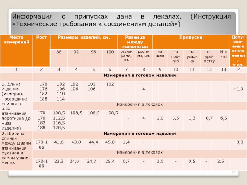 Слайд 19Информация о припусках дана в лекалах. (Инструкция «Технические требования к соединениям