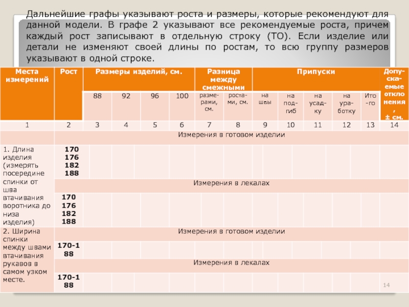 В графе 2 указывают все рекомендуемые роста, причем каждый рост записывают в отдельную строку (ТО). Если изделие или детали не изменяют своей длины по ростам, то всю группу размеров указывают в одной строке.