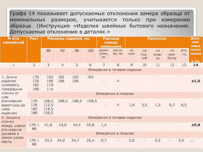 Слайд 22Графа 14 показывает допускаемые отклонения замера образца от номинальных размеров, учитывается