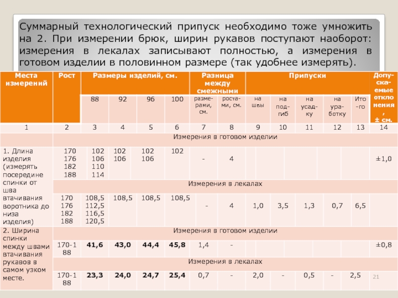 Слайд 21Суммарный технологический припуск необходимо тоже умножить на 2. При измерении брюк,
