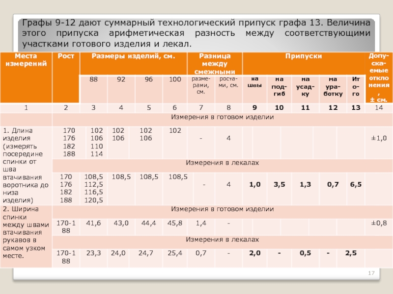 Слайд 113 Разработка таблицы измерения лекал и готового изделия