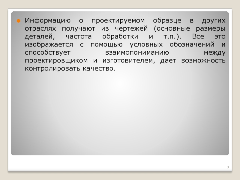Слайд 3Информацию о проектируемом образце в других отраслях получают из чертежей (основные