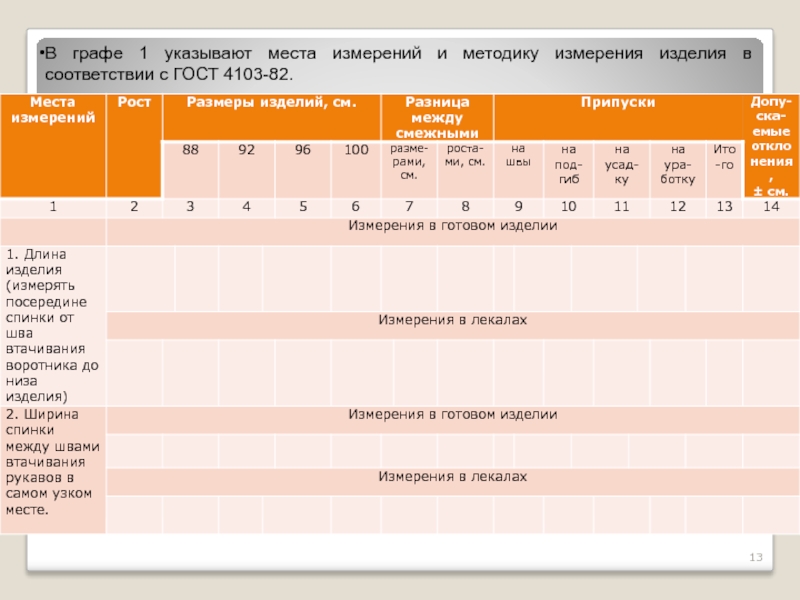 Слайд 13В графе 1 указывают места измерений и методику измерения изделия в