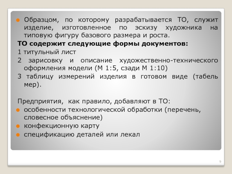 Слайд 9Образцом, по которому разрабатывается ТО, служит изделие, изготовленное по эскизу художника