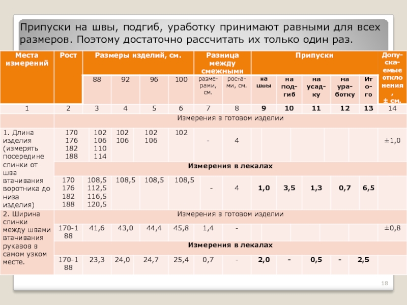 Слайд 18Припуски на швы, подгиб, уработку принимают равными для всех размеров. Поэтому