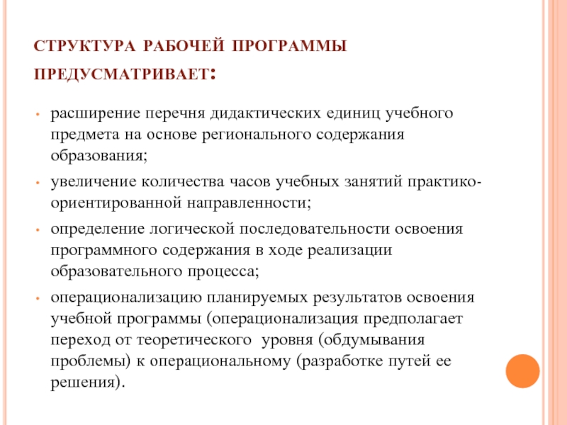 операционализацию планируемых результатов освоения учебной программы (операционализация предполагает переход от теоретического уровня (обдумывания проблемы) к операциональному (разработке путей ее решения).