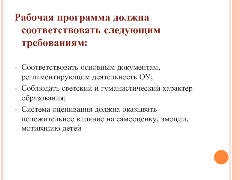 Слайд 4Рабочая программа должна соответствовать следующим требованиям: