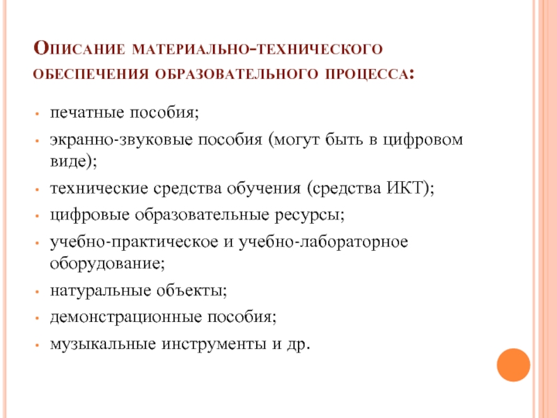 Слайд 12Описание материально-технического обеспечения образовательного процесса:
