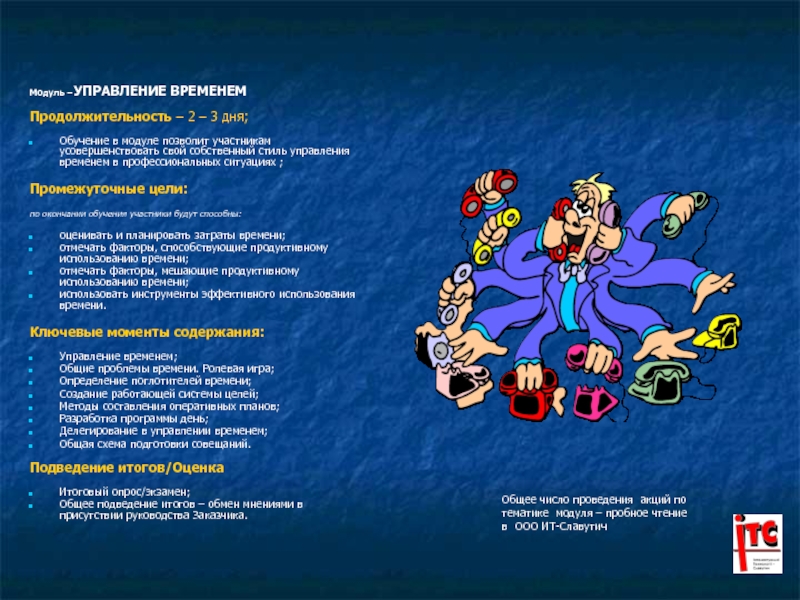 Обучение в модуле позволит участникам усовершенствовать свой собственный стиль управления временем в профессиональных ситуациях ;