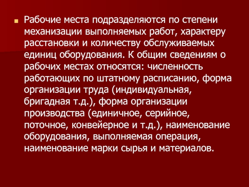 Слайд 9Рабочие места подразделяются по степени механизации выполняемых работ, характеру расстановки и