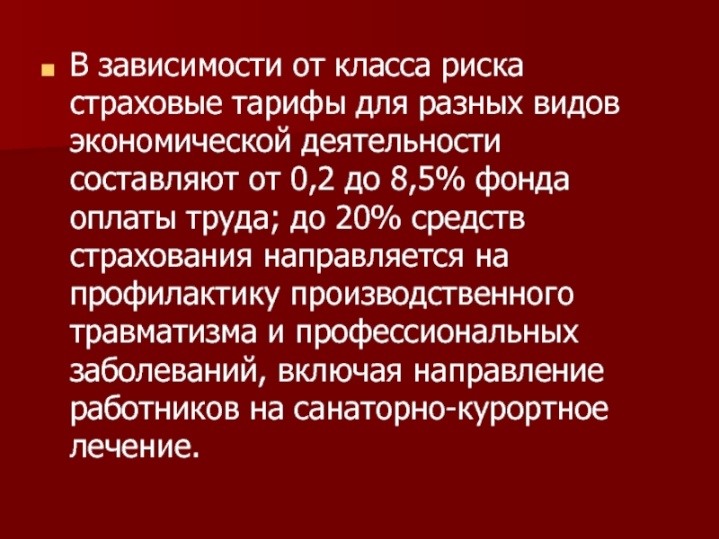 деятельности составляют от 0,2 до 8,5% фонда оплаты труда; до 20% средств страхования направляется на профилактику производственного травматизма и профессиональных заболеваний, включая направление работников на санаторно-курортное лечение.