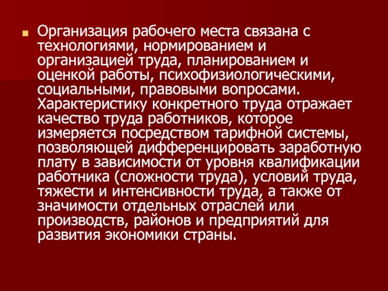 и оценкой работы, психофизиологическими, социальными, правовыми вопросами. Характеристику конкретного труда отражает качество труда работников, которое измеряется посредством тарифной системы, позволяющей дифференцировать заработную плату в зависимости от уровня квалификации работника (сложности труда), условий труда, тяжести и интенсивности труда, а также от значимости отдельных отраслей или производств, районов и предприятий для развития экономики страны.