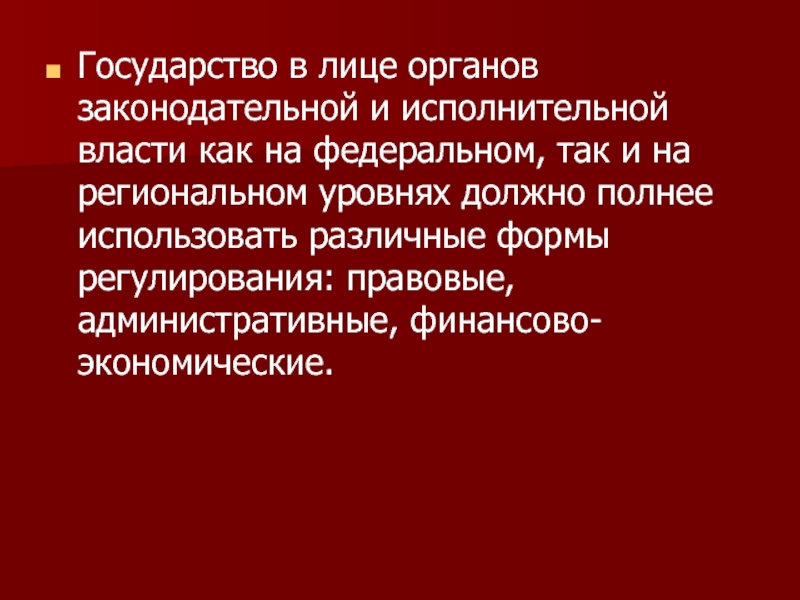 так и на региональном уровнях должно полнее использовать различные формы регулирования: правовые, административные, финансово-экономические.