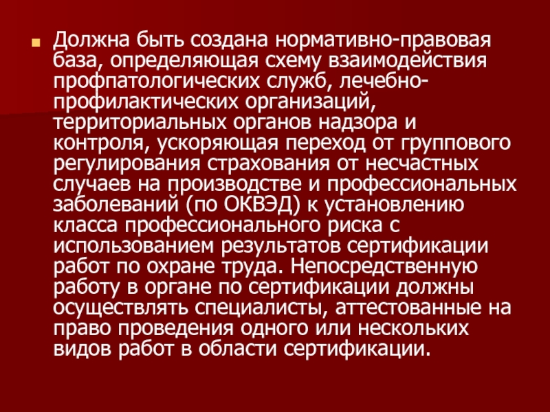 Слайд 27Должна быть создана нормативно-правовая база, определяющая схему взаимодействия профпатологических служб, лечебно-профилактических