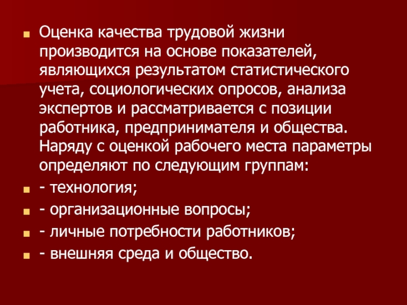 Слайд 11Оценка качества трудовой жизни производится на основе показателей, являющихся результатом статистического
