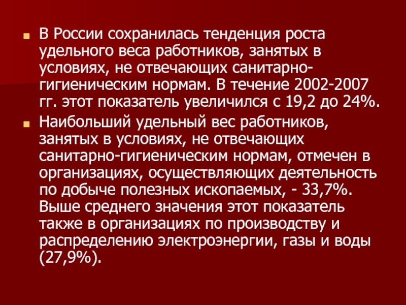 Слайд 13В России сохранилась тенденция роста удельного веса работников, занятых в условиях,