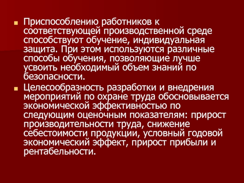 Слайд 31Приспособлению работников к соответствующей производственной среде способствуют обучение, индивидуальная защита. При