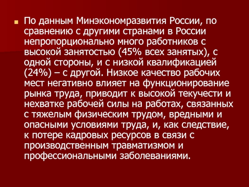 непропорционально много работников с высокой занятостью (45% всех занятых), с одной стороны, и с низкой квалификацией (24%) – с другой. Низкое качество рабочих мест негативно влияет на функционирование рынка труда, приводит к высокой текучести и нехватке рабочей силы на работах, связанных с тяжелым физическим трудом, вредными и опасными условиями труда, и, как следствие, к потере кадровых ресурсов в связи с производственным травматизмом и профессиональными заболеваниями.