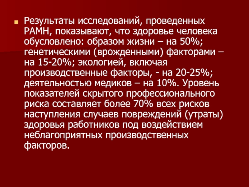 Слайд 19Результаты исследований, проведенных РАМН, показывают, что здоровье человека обусловлено: образом жизни