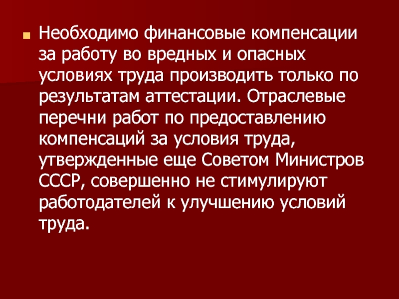 производить только по результатам аттестации. Отраслевые перечни работ по предоставлению компенсаций за условия труда, утвержденные еще Советом Министров СССР, совершенно не стимулируют работодателей к улучшению условий труда.