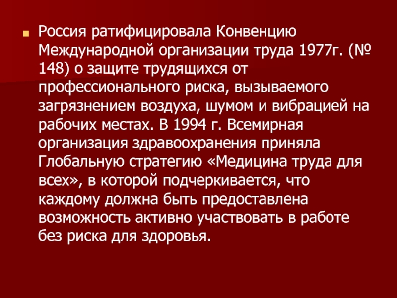 трудящихся от профессионального риска, вызываемого загрязнением воздуха, шумом и вибрацией на рабочих местах. В 1994 г. Всемирная организация здравоохранения приняла Глобальную стратегию «Медицина труда для всех», в которой подчеркивается, что каждому должна быть предоставлена возможность активно участвовать в работе без риска для здоровья.